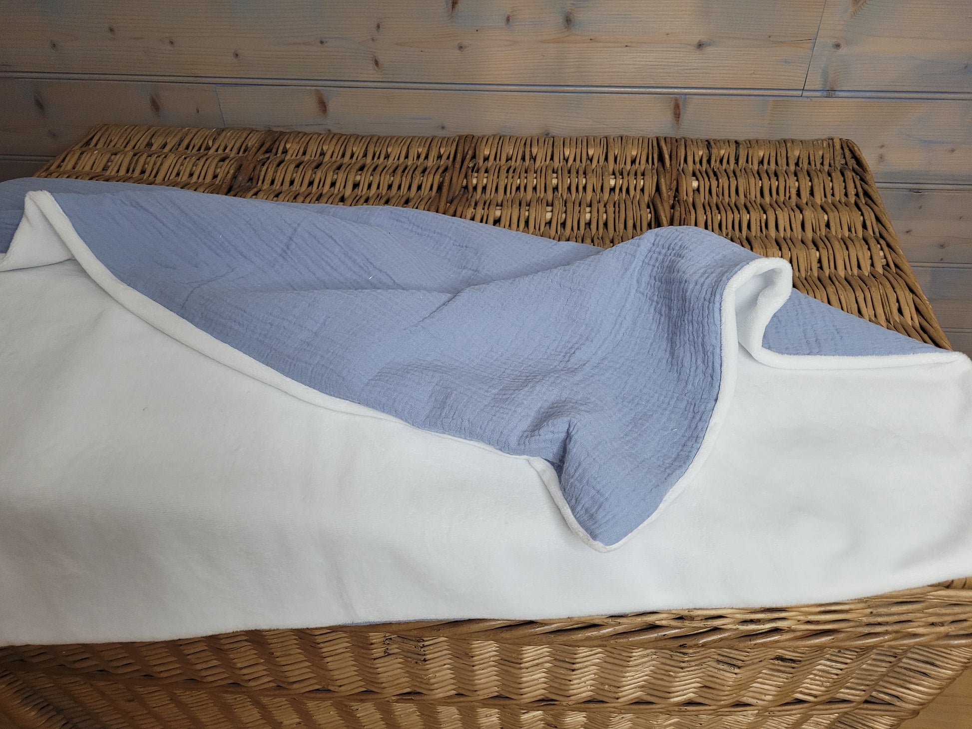 Couverture pour bébé en double gaze de coton d'un côté et minky de l'autre.