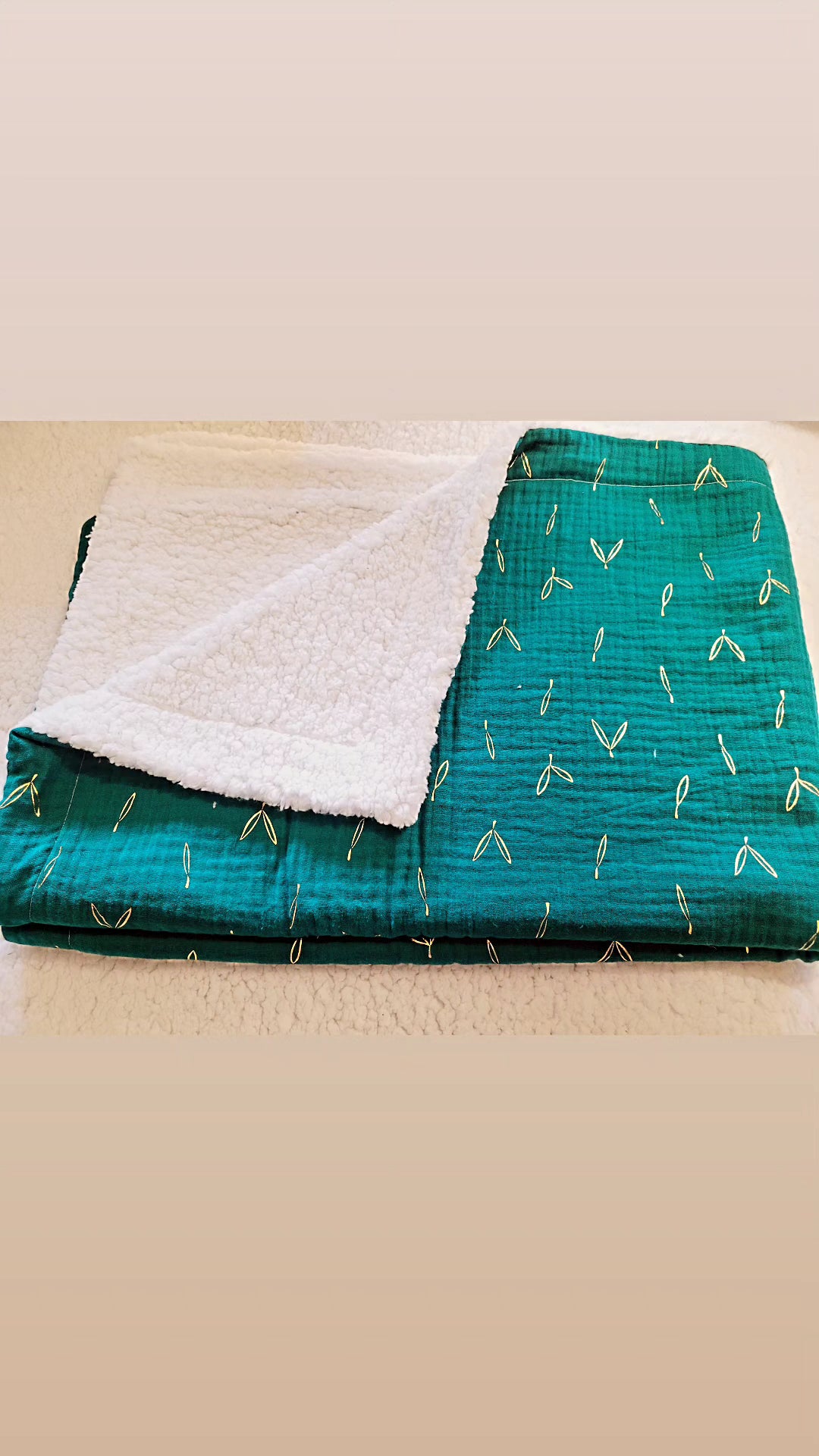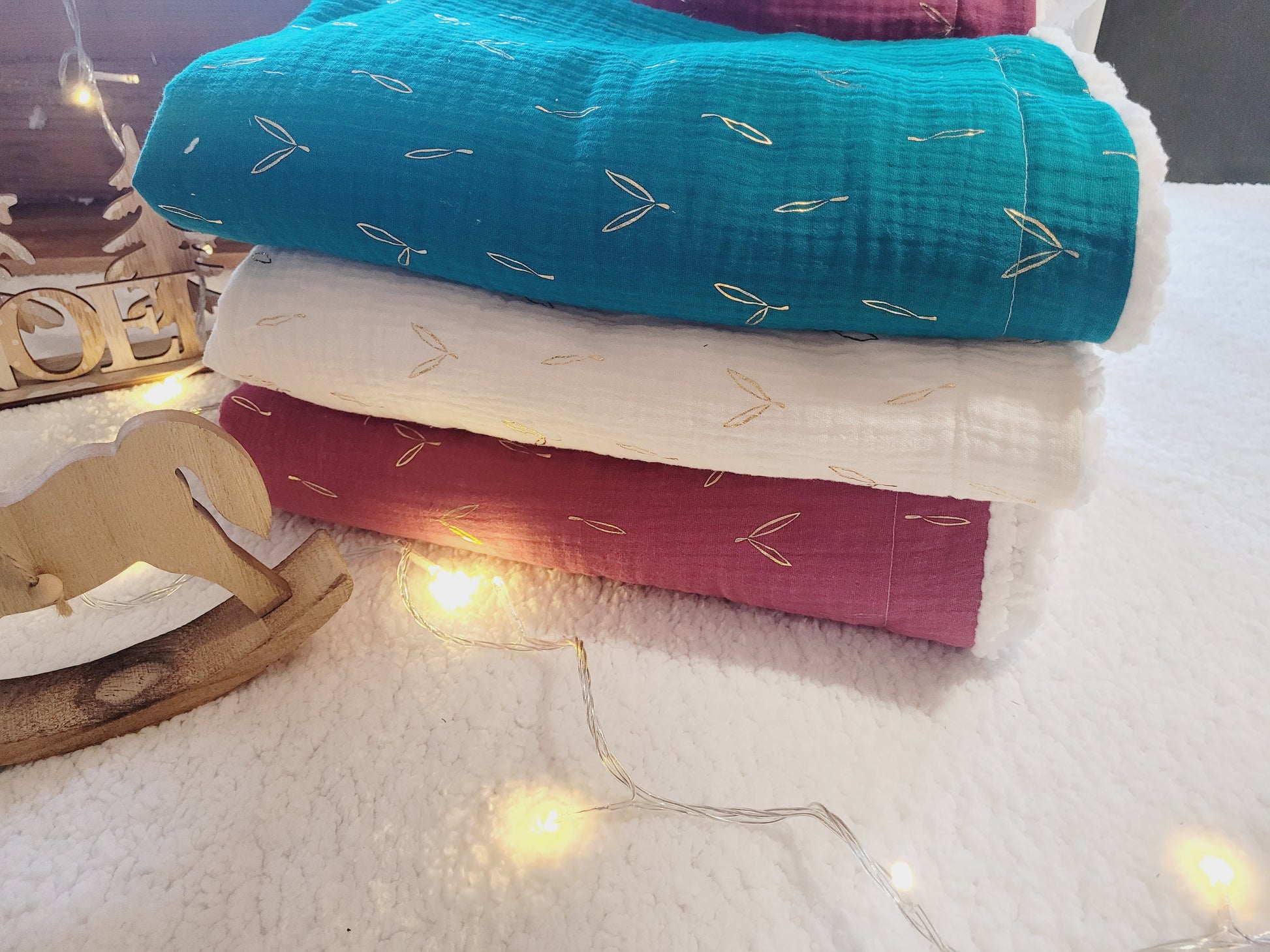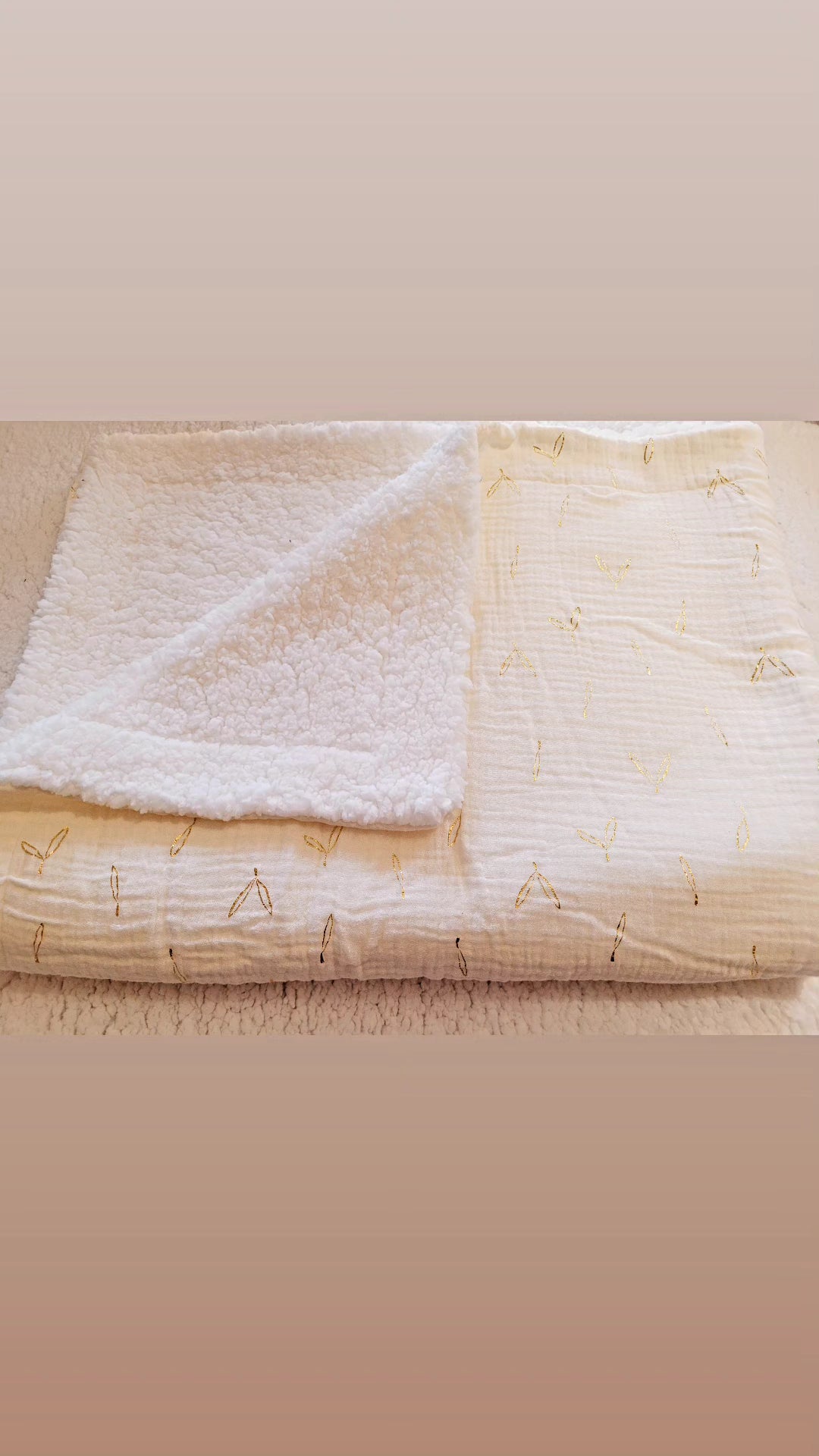 Couverture pour bébé en double gaze de coton d'un côté et sherpa de l'autre.