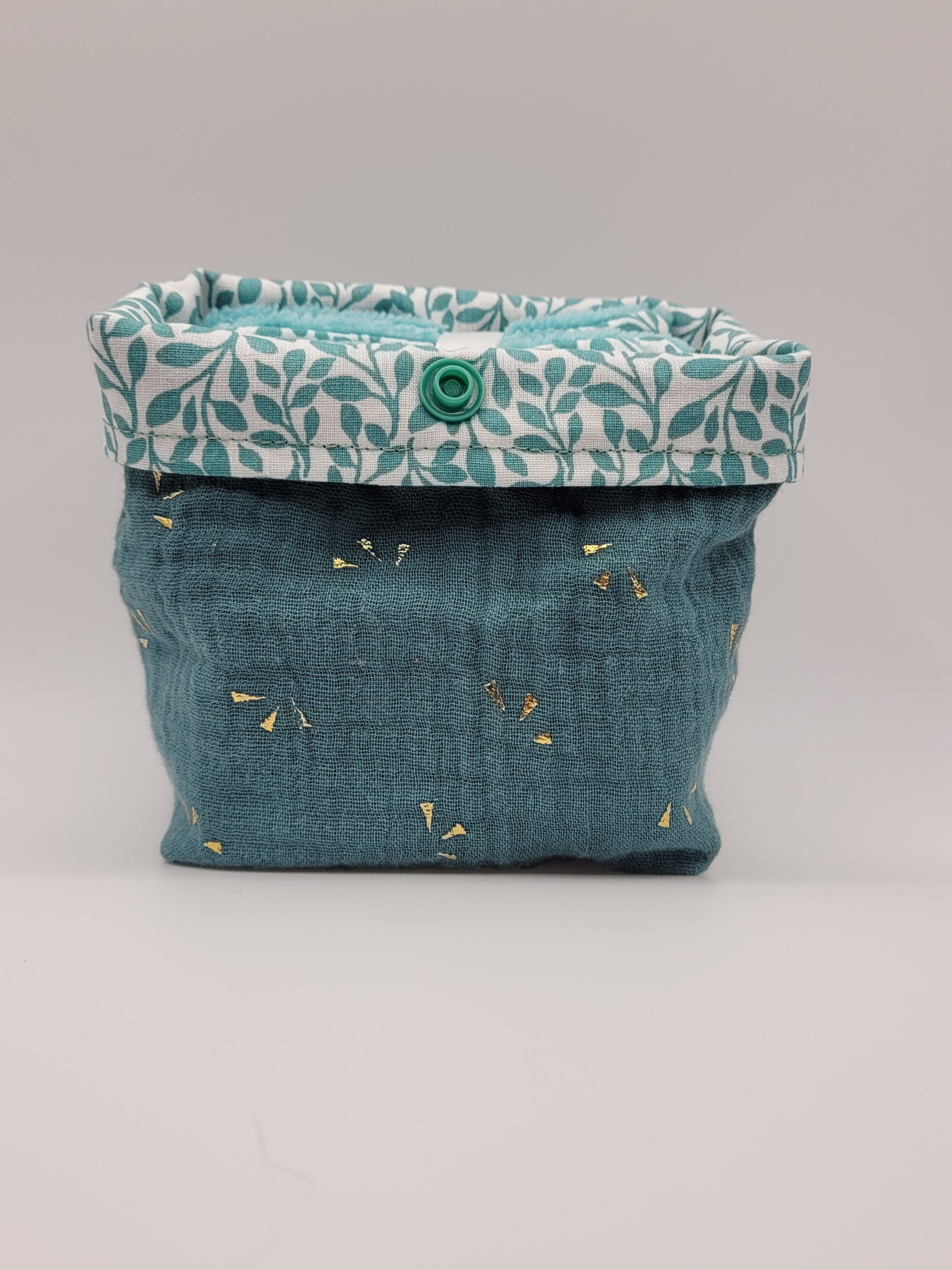 Lot de 7 lingettes environ 8 x 8 cm en coton bio et micro éponge bambou + son panier de rangement avec bouton pression pour pouvoir l'emporter partout avec vous.