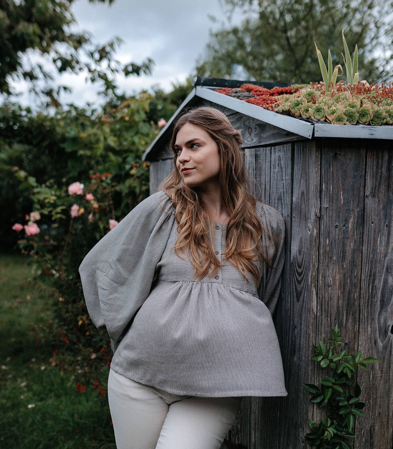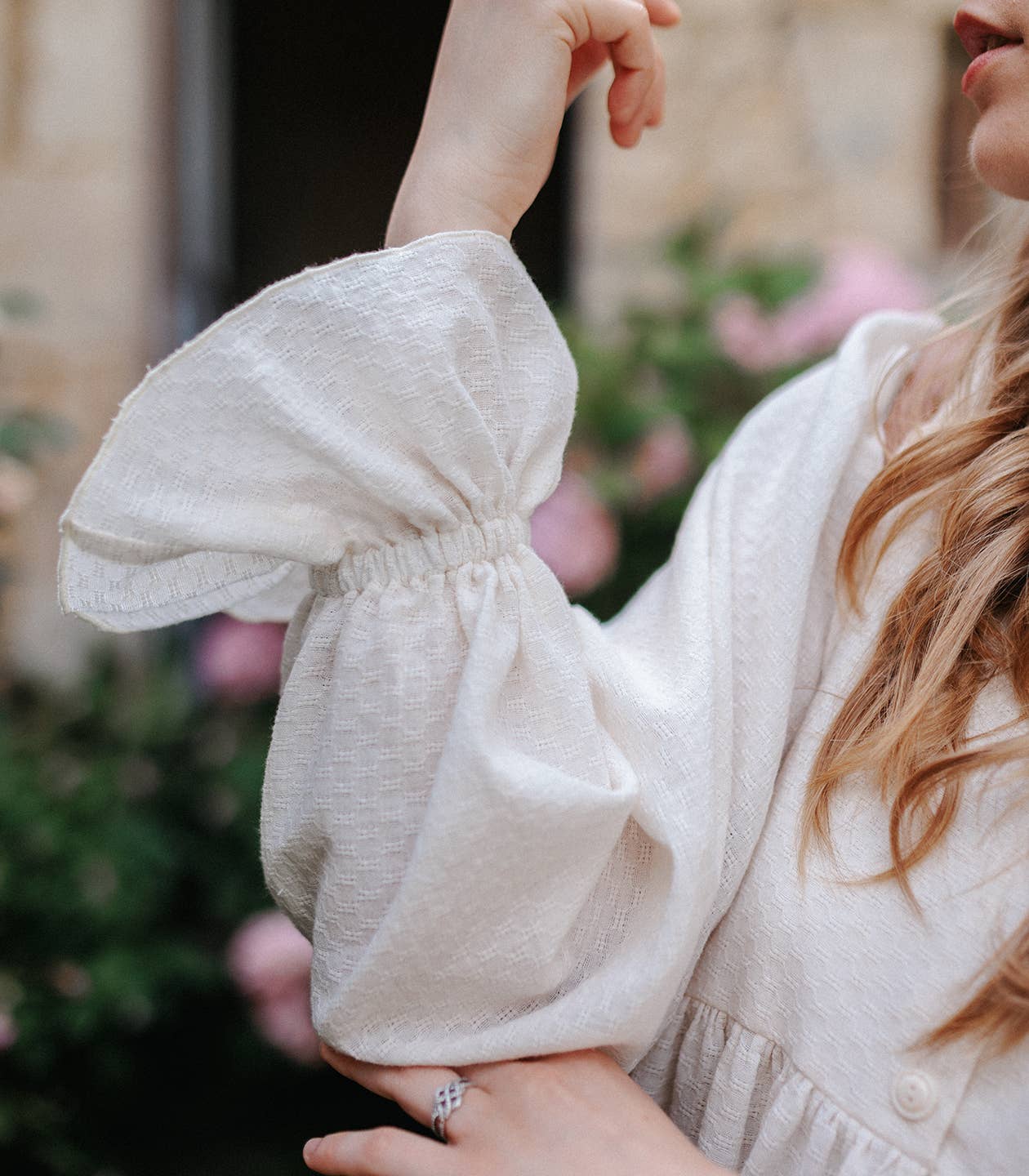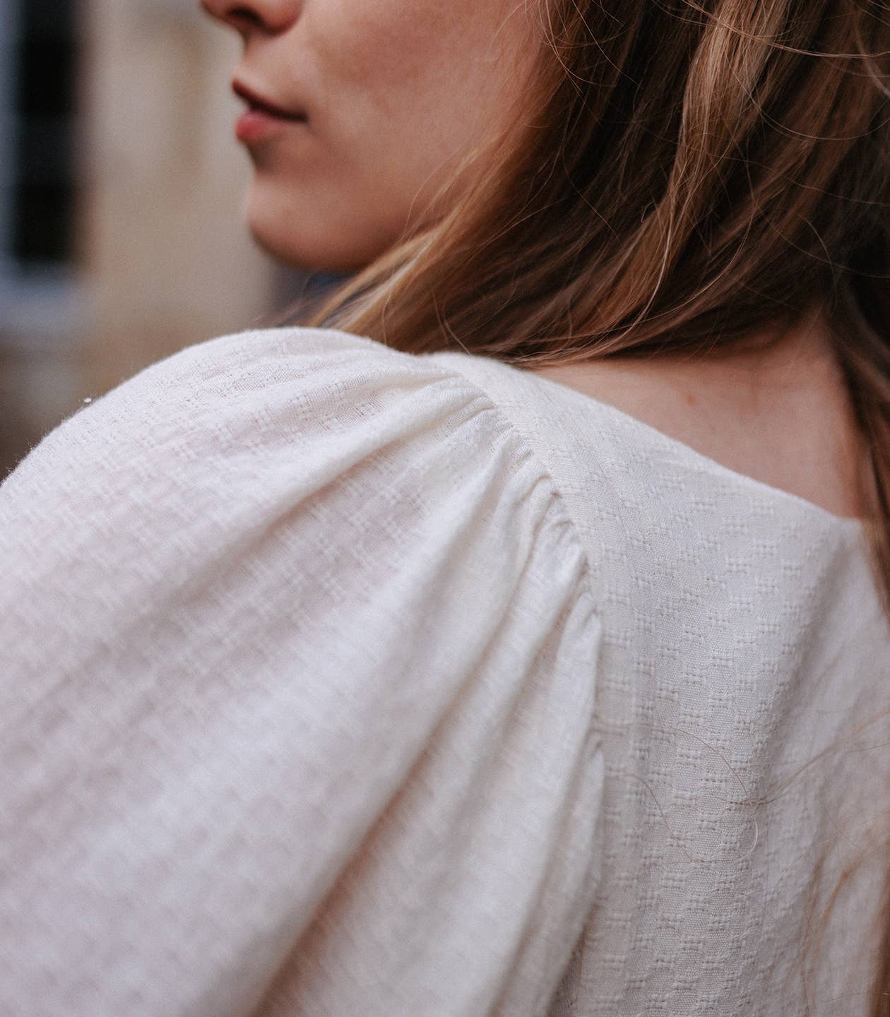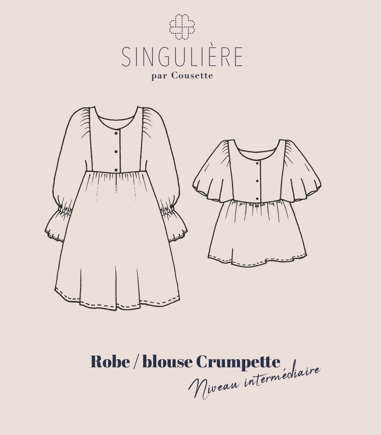 Crumpette est une blouse (ou une robe) avec des empiècements devant et dos "effet plastron". Une multitude de fronces partent des empiècements au milieu devant et dos ainsi qu’aux épaules. Elle est très ample avec une ligne sous poitrine légèrement arrondie devant. Les manches, directement attenantes aux empiècements sont gigantesques: longues, elles sont resserrés par un élastique dans une coulisse pour un effet volanté alors que courtes, elles sont comme un maxi volant tombant sur les épaules.
